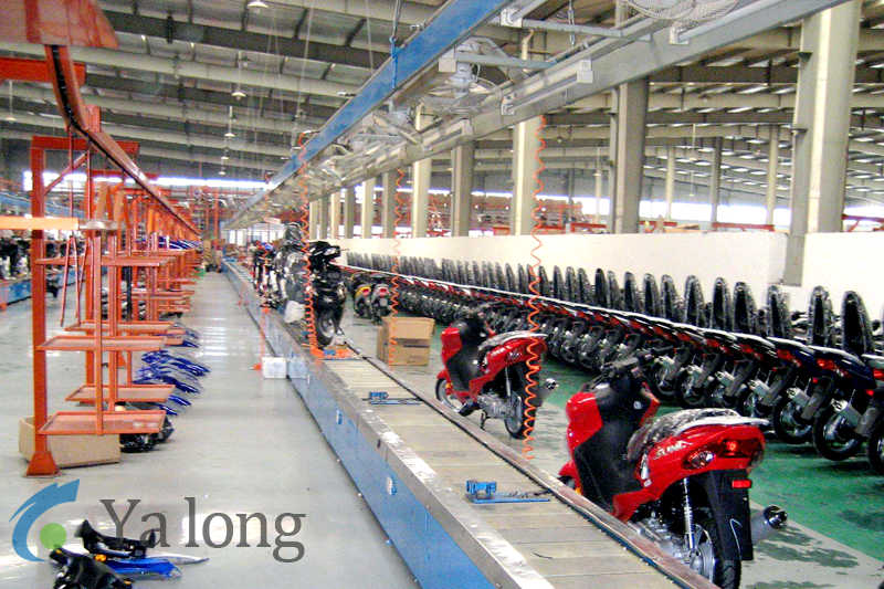 The electric motorcycle assembly line mainly adopts a continuously running steel chain plate conveying line to carry the motorcycle along a fixed path and adapt to the operating rhythm of each station. Guardrails are arranged on both sides of the line to prevent rollover, and there are also jacking and translation mechanisms to facilitate sequencing and positioning. The suspended conveyor chain is equipped with tooling and clamps to hoist handles, seats and other parts. Through track planning, materials can be accurately delivered to the assembly station, realizing aerial distribution and saving ground space.